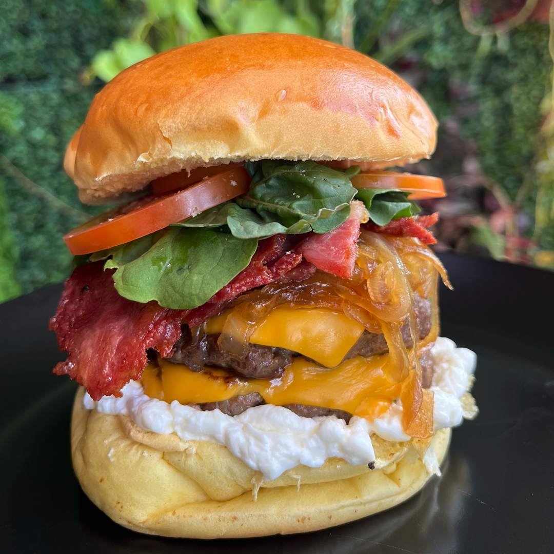 2 HAMBÚRGUERES, CEBOLA CARAMELIZADA, BACON CROCANTE, CHEDDAR, CREAM CHEESE, TOMATE E RÚCULA.